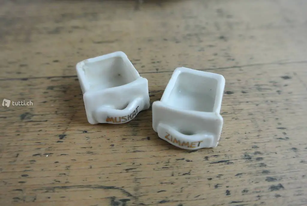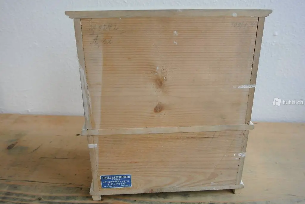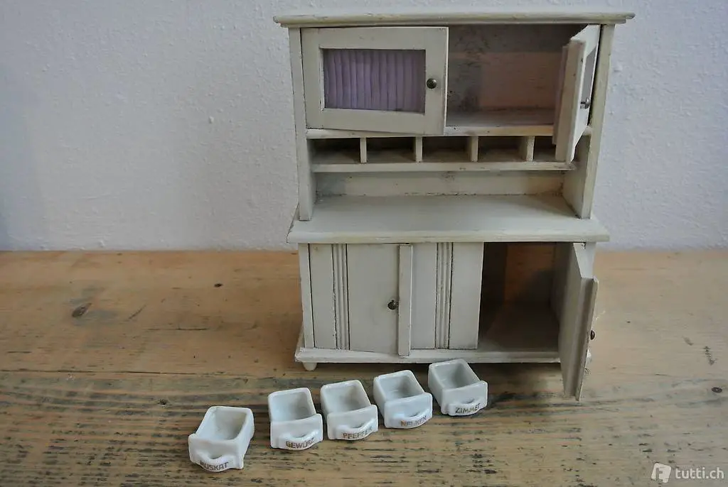 Seltenes Schränkli weiss mit alten Porzellanschubladen / Masse L 18 cm B 7 cm H 21 cm / Versand 7.- oder Abholung.