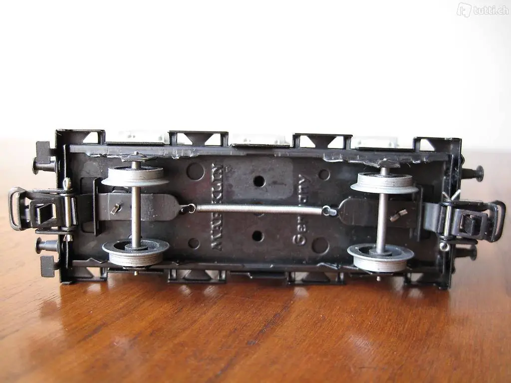 2 Achsen, RELEX-Kupplung, Länge 10,5cm, schwarzes Blech-Untergestell, 3 grau abnehmbare zylindrische Kunststoff-Behälter mit VTG-Signet, Bremserbühne mit Geländer