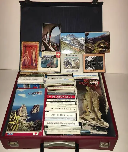 Valigetta colma di foto e souvenir di città, luoghi paesaggi anni 50/60/70, 52 articoli.