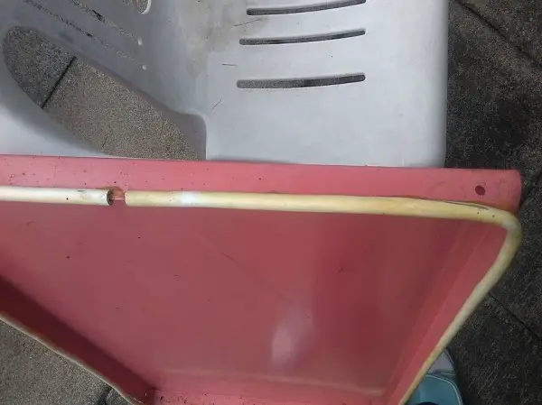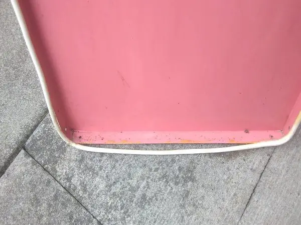 Tischplatte für Campingtisch. Einbrennlackiert. 60er Jahre. War in einem VW-Bulli. Schutzgummi an Kanten muss wieder eingefahren werden. Masse: 50cm × 80cm. Lieberhaber-Artikel. Abholung, Barzahlung.