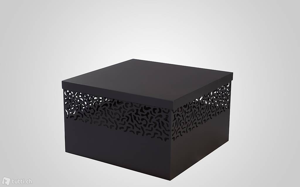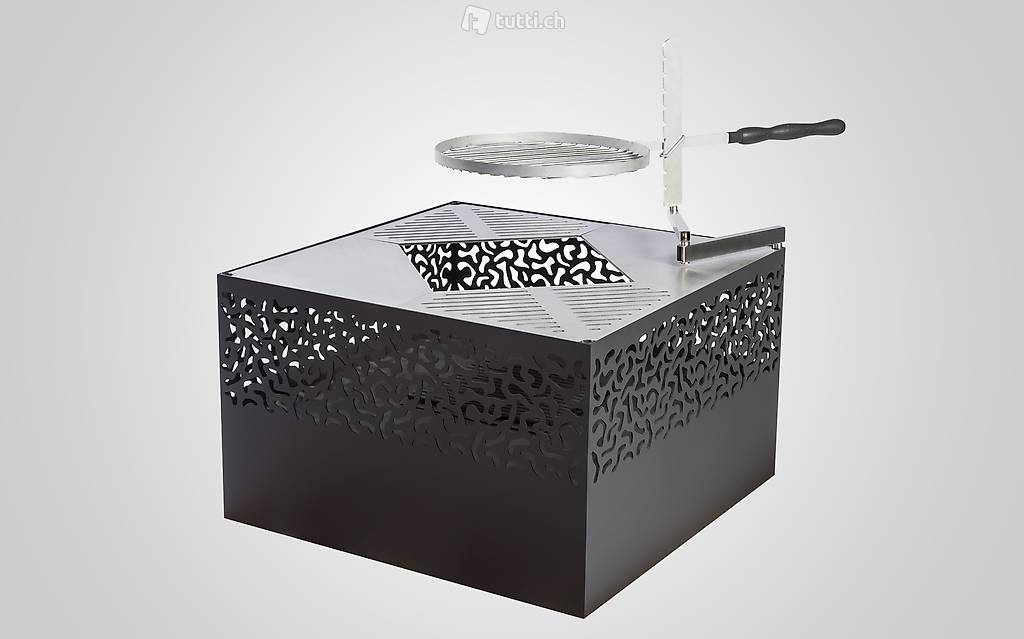 Bodennah, wie ein Lagerfeuer. Automatisch setzt man sich hier rund um das viereckige Gartenfeuer und geniesst die natürliche Romantik. Das gelaserte Lochmuster an den Seiten verstärkt das Flammenmuster im