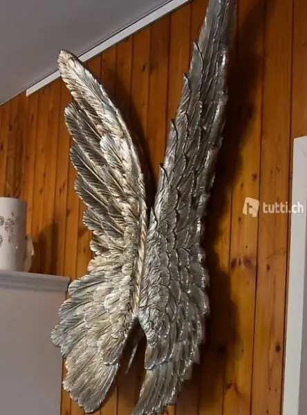 ohne Engel, somit ohne jeglichen Anflug von Kitsch. Silbrig / goldig dreidimensionale glänzende Flügel. Das symmetrische Objekt hat etwas Mystische an sich, was das Auge magisch anzieht.