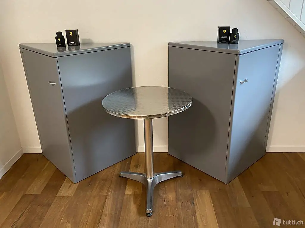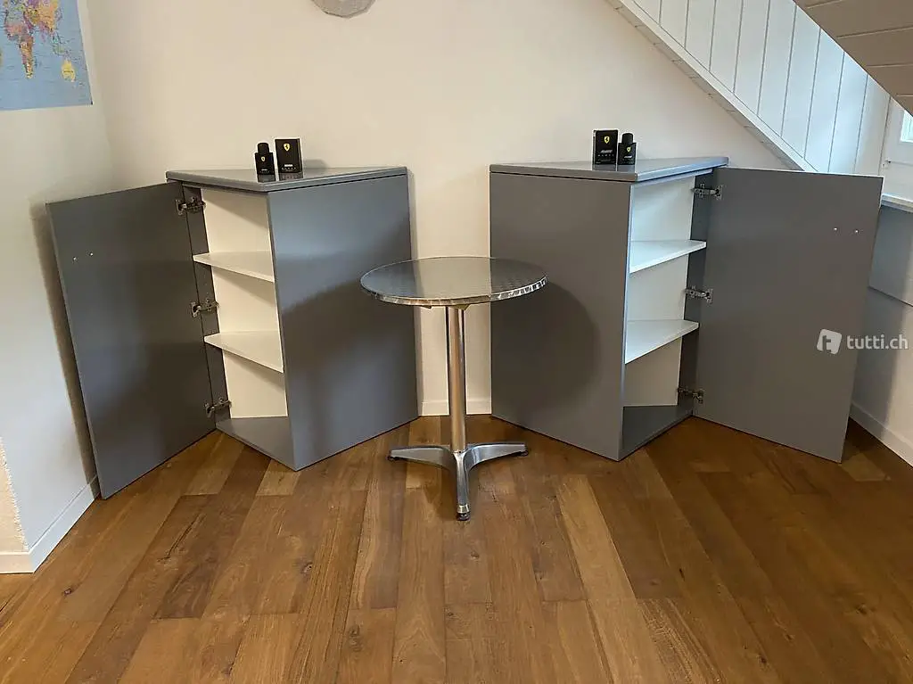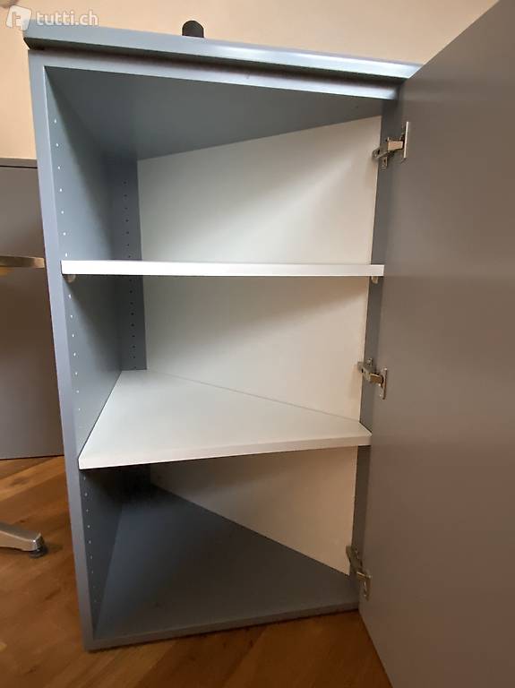 Möbel können auch einzeln aufgestellt werden. Grösse H/B/T 1020/870/460 mm. Ausführung: Sichtteile aussen in MDF grau gespritzt, Tablare und