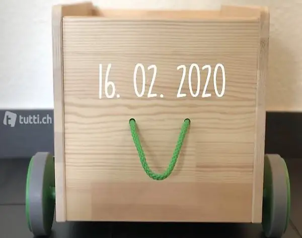 Spielkiste aus Holz von Ikea mit grünen Rädern, nicht zusammengeschraubt