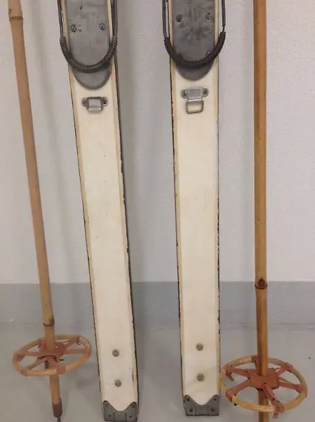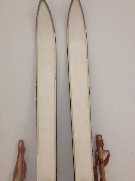 Ski, alte Holzski mit Kanten und Stöcken.