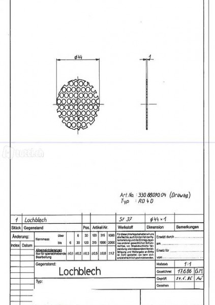 Lochblech aus St37, Durchmesser 44 mm, Dicke 1 mm (1371-TWH)