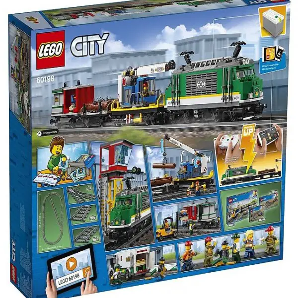 Dieses coole LEGO City Set enthält eine motorisierte Lokomotive mit Bluetooth-Fernsteuerung (10 Geschwindigkeitsstufen) und zugänglichem Führerstand, einen Kranwaggon mit dreh- und ausfahrbarem Ausleger, einen Containerwaggon, einen Holzwaggon sowie einen gepanzerten