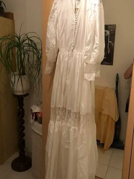 Abito da sposa fatto da una sarta taglia S/M formato da tre parti, sottoveste e gonna in tulle per rimanere largo, con coda , allacciato sul dietro con piccoli bottoncini rivestiti di stoffa.
