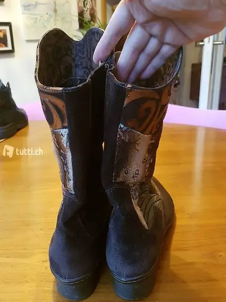 Leder mit hochwertiger Gummisohle und Harris-Tweed-Futter. Verziert mit Brokat, Samt und gemustertem und metallisiertem Leder.