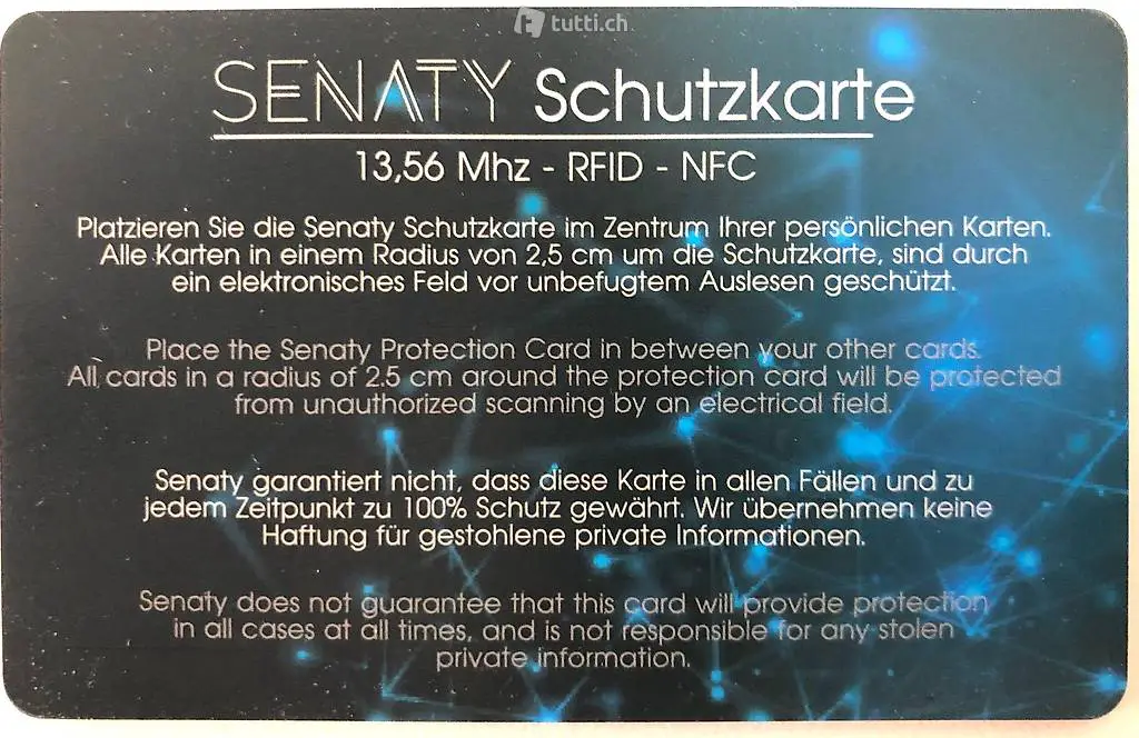 - 1 Senaty RFID/NFC Blocker Card (avec un radius de 2,5 cm)
