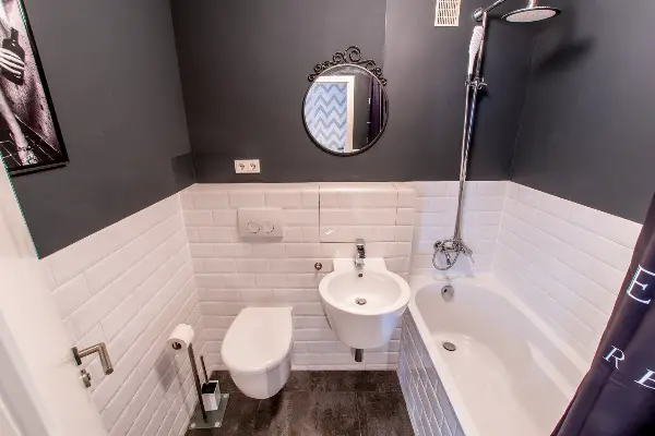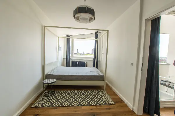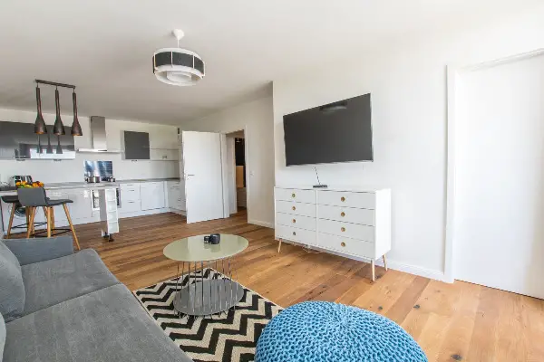 Durch eine grosse Fensterfront präsentieren sich Schlaf- und Wohnbereich hell und lichtdurchflutet. Das Badezimmer ist mit einer komfortablen Badewanne, zeitlosen Blanco-Metrofliesen, dunklen Bodenfliesen und hochwertigen Armaturen ausgestattet. Fernsehen können sie auf einem 55 Zoll Samsung LED Fernseher geniessen. Ein Einbauschrank im Eingangsbereich bietet zusätzlichen Stauraum.