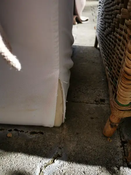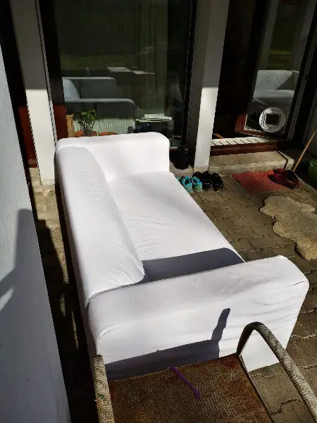 Sofabeine fehlen und der Bezug hat eine gerissene Naht unten rechts. Diese kann genäht werden, oder man erwirbt einen neuen Bezug bei IKEA.