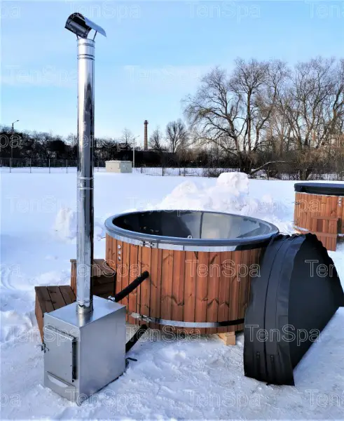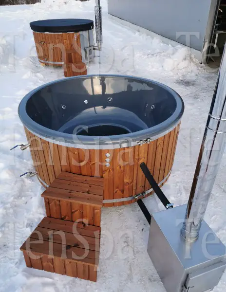 Das Gesamtpaket umfasst ein isoliertes Hot Tub aus stabilem Glasfaserkunststoff (GfK) für 6-8 Personen, einen Edelstahl (AISI 316) Aussenofen, sechs Hydro JET
