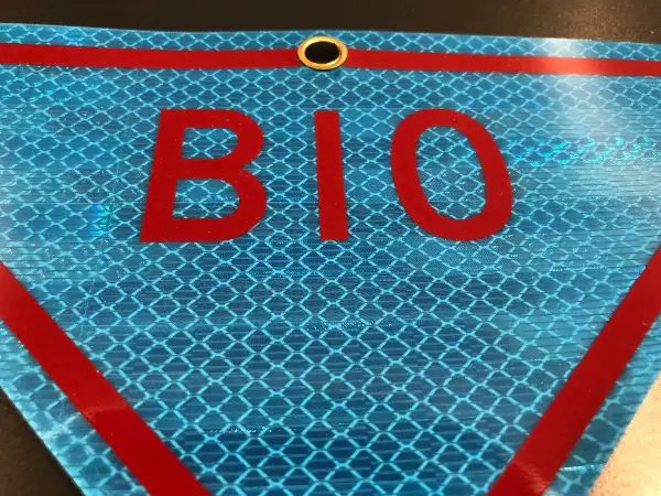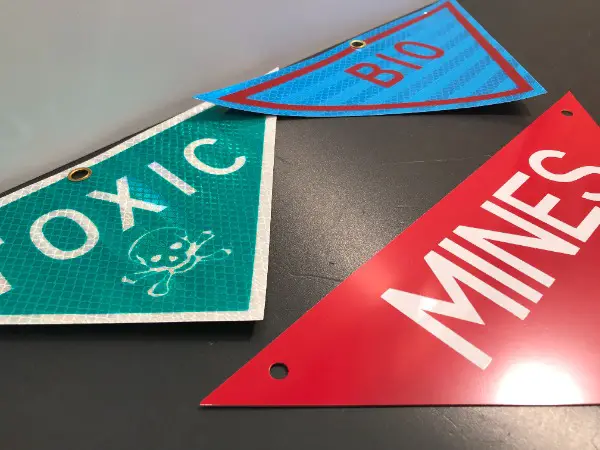 2x seltene wie sehr dekorative Reflektor Flag - Fahne zur Markierung verseuchter - kontaminierter Bereiche; TOXIC und BIO Kampfstoffe // alle drei sind ORIGINALE der US-Army // aus sehr solidem Kunstoff mit reflektierender Oberfläche analog einem Strassenschild - Warnschild // mit solider Öse // 1x Warnschild DANGER MINES - ACHTUNG MINEN MINENFELD SPRENGFALLE // Grösse der Längsseite ca. 290mm x Höhe 145mm