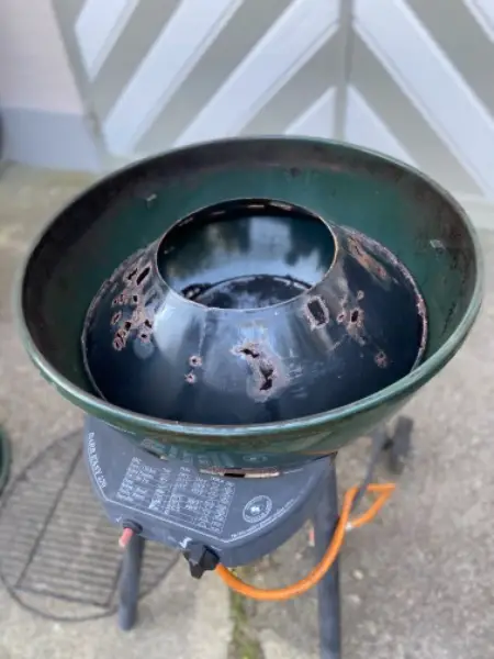 Der Grill ist alt aber funktionstüchtig, Rostspuren am Tricher sind nicht zu leugnen, aber der