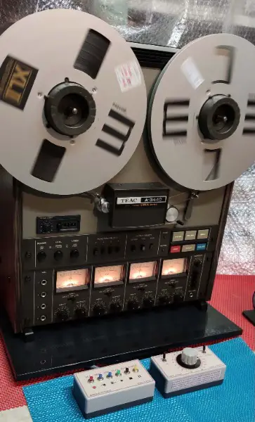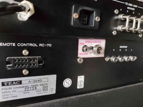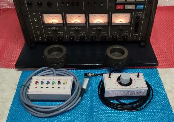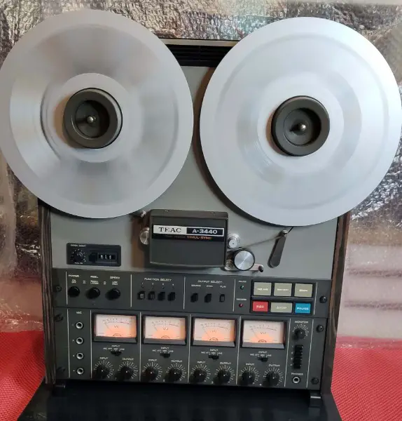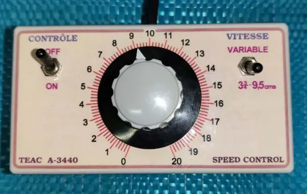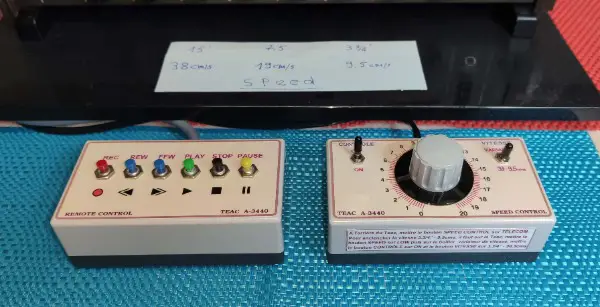A vendre exceptionnel appareil à bande Teac A-3440 ayant les 3 vitesses 3.3/4’ (9, 5cms) – 7.1/2’ (19cms) – 15’ (38cms) . Unique car équipé d’une télécommande et d’un variateur de vitesse externe à très large plage. La longueur des câbles est de 3 mètres. En plus de faire varier la vitesse, le boîtier speed control est équipé d’une position fixe calibrée sur la vitesse de 3.3/4’ (9, 5cms) qui n’existe pas sur ces appareils. Un service de l’appareil é été fait et les courroies remplacées par des neuves. Tout est impeccable et fonctionne très bien. Ce merveilleux Teac A-3440 est vendu comme sur les photos avec les adaptateurs NAB. Les bandes ne font pas partie de la vente.