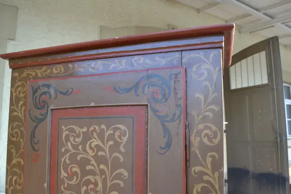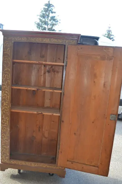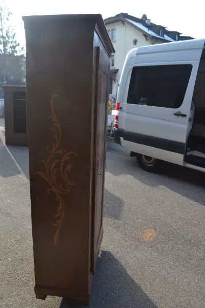 Schrank..Schrank hat Malerei drauf mit gebrauchspuren.Könnte neu bemalt werden oder Schrank Ablaugen Abbeizen und Auffrischen.H184cm B97cm T43cm