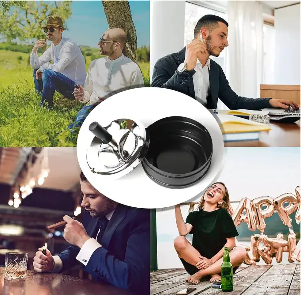 ???Einfach zu Bedienen? Der sich drehende Aschenbecher hat ein um 360 Grad drehbares Design und ist sehr bequem zu bedienen. Sie können den Russ in die Sammelkammer unten giessen, indem Sie den Knopf oben drücken und den Deckel drehen.