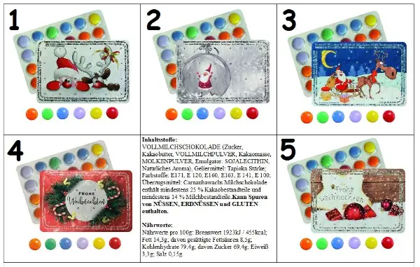 (Nummern 1-5 mit Schokolinsen (ALLERGIKER: Kann Spuren von Nüssen, Erdnüssen oder Gluten enthalten))