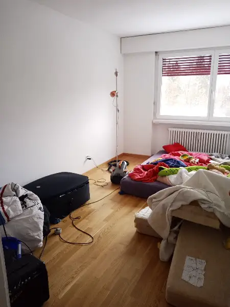 Im Wohnzimmer ist noch das alte Parkett, im zweiten grösseren Zimmer (bei uns Kinderzimmer) ist Laminat. Die Küche, WC und Badezimmer ist aus einem unempfindlichen Kunststoff Boden.