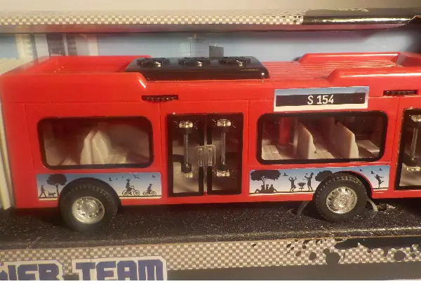 Kunststoff / Zurückziehen - loslassen und der Bus fährt weg / Braucht keine Batterien / geeignet für Jugendliche ab 4 Jahren / mit diesem super Stadtbus wo man auch die Türen öffnen und schliessen kann / können Sie den Jugendlichen eine grosse Freude machen /in der Originaler Verpackung / neu und unbespielt