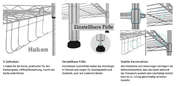 GROssER RAUM: Das 6-stufige Design und 1 seitliche Aufhängung (mit einer Grösse von 21,26 x 11,42 x 62,99 Zoll) können leicht zu einer sauberen Küche beitragen, das Gitterregal zwischen den einzelnen Ebenen ist verstellbar, Sie können Mikrowelle, Reiskocher, Entsafter, etc, die Haken der Seite Aufhänger können Hacken Messer, Pfannen, Gurgeln, Handtücher hängen, wie Sie möchten.