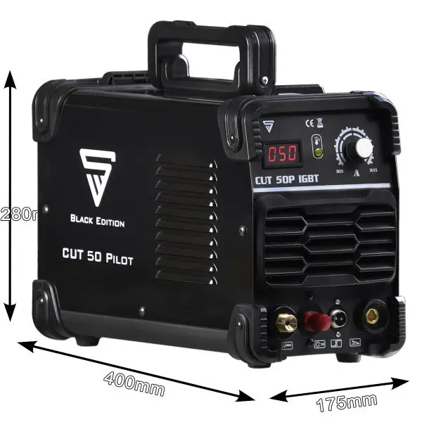 Plasmaschneider liefert kraftvolle 50 Ampere und verfügt über eine präzise Hochfrequenz (HF) Pilotzündung für ein erstklassiges Zündverhalten. Die Schneidleistung beträgt materialabhängig bis zu 14 mm (Baustahl ST37 bis 14 mm, V2A oder V4A bis 8 mm, Aluminium bis 5 mm). Der Plasmacutter eignet sich neben den gängigen leitenden Metallen ebenfalls für lackierte Bleche und Flugrost. Der Schneidstrom lässt sich stufenlos von 15 bis 50 Ampere einstellen. Das kompakte