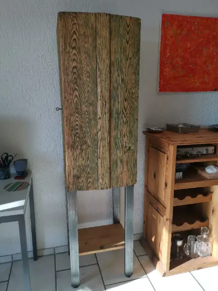 Das Möbel besteht aus einer alten Truhe die komplett gebürstet wurde und ein Untergestell aus massivem Metall.