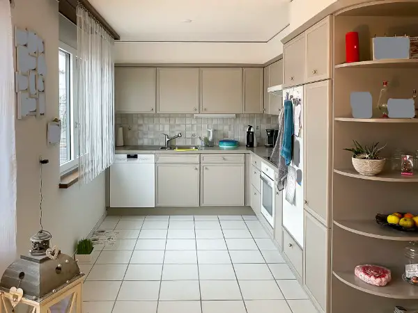 Küche und der Wohnbereit sind sehr hell und ohne Abtrennung gebaut. Der
