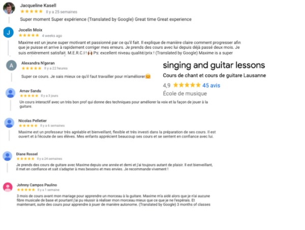 Je propose des cours de chant ainsi que de guitare acoustique à Lausanne (Pully) ou via skype.