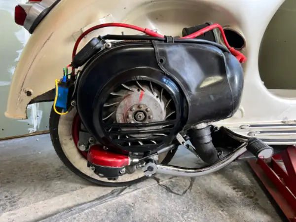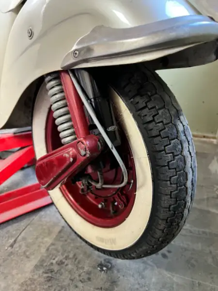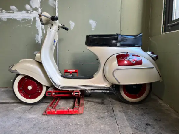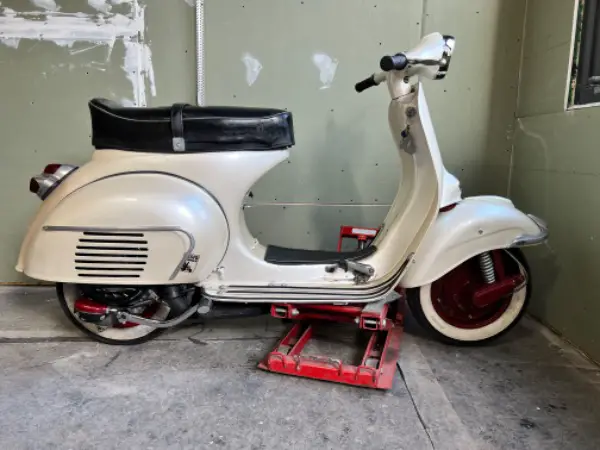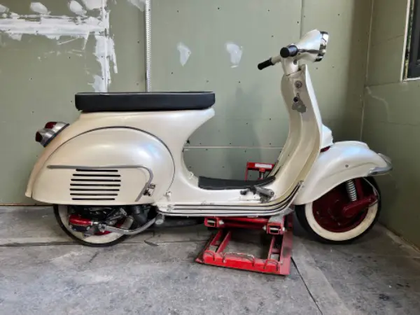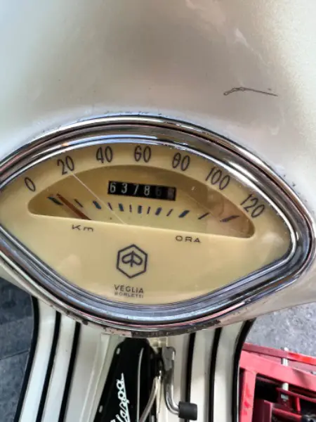 Vespa wurde vor Jahren mal restauriert und mit einem Perlmutt Lack versehen. Einige Teile sind in rotmetallic lackiert. Bereits paar Gebrauchsspuren.