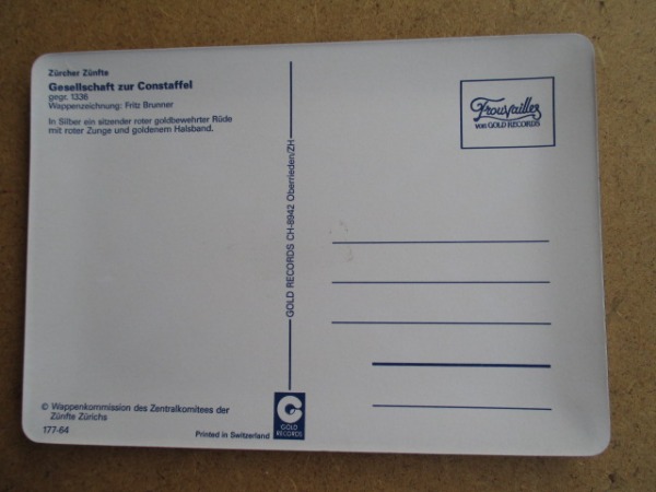 Postkarte aus Blech. Zürcher Zunftwappen 1336 Gesellschaft zur Constaffel. Schöne Hochglanz Blechpostkarte,noch in Folie abgepackt. Länge 14,5 cm Breite.10 cm. Dick 2 mm.Hinterseite, Beschreibung der Historischer Geschichte. Abholung vor Ort . Postversand möglich. Vorkasse!