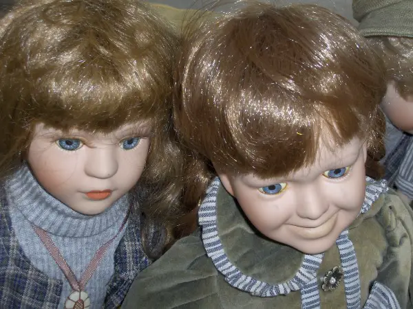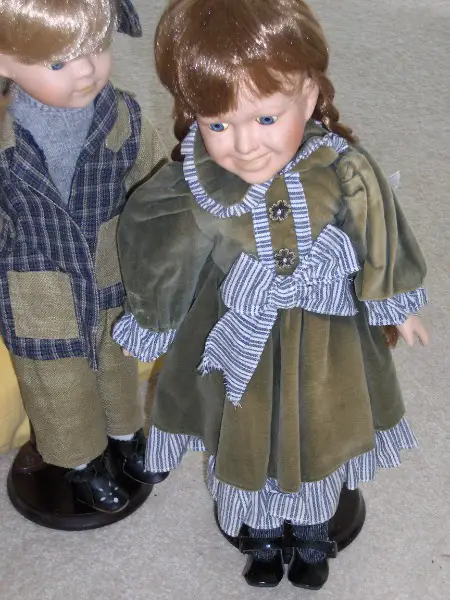 2 sehr hübsche, adrett gekleidete, liebe Porzellanpuppen-Mädchen in ausgezeichnetem Zustand (nur als