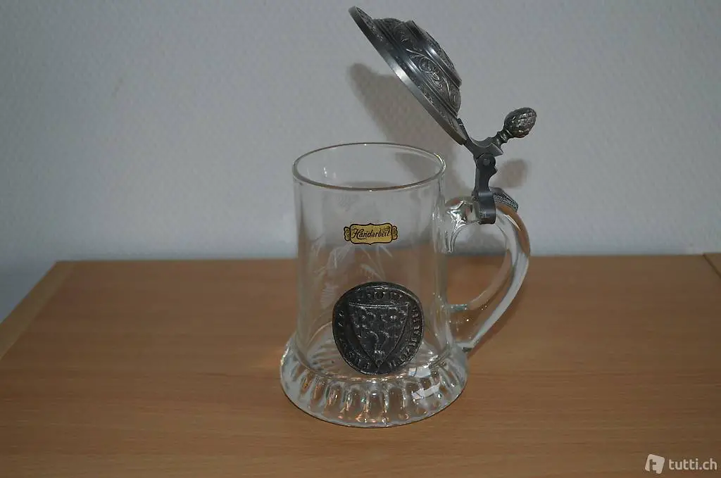 Kristallglas mit Zinn-Deckel und Stadtsiegel / Inschrift
