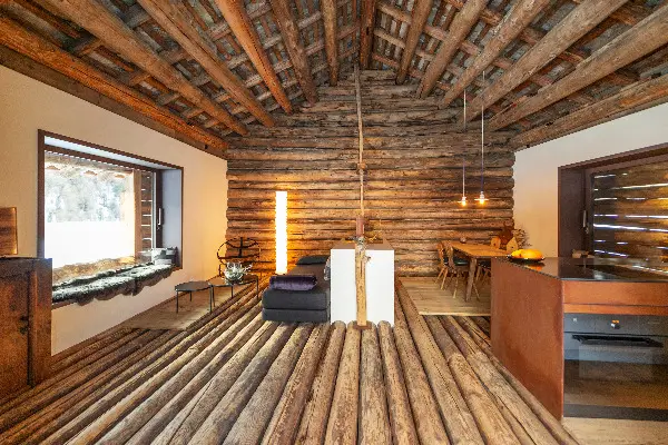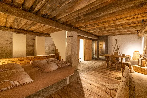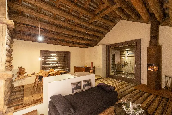 Tisch und Stühle geschaffen. Eindrücklich ist die Innenansicht der Westwand, welche aus alten Rundhölzern in Strickbauweise besteht und mit einer ca. 400 jährigen Holzspange über die ganze Raumhöhe von 5 Metern stabilisert wurde. Im Innern der Wohnscheune wurde auf drei Seiten (Norden, Osten und Süden) je eine isolierte und mit einer Wandheizung versehene Fassadenwand eingebaut. Nach Norden, Osten und Süden sind grosse Panoramafenster mit Blick auf das Scheunentor, respektive auf die Innenseite der Rundholzbalkenfassade die ursprüngliche Scheune spürbar, respektive nach Süden bei geöffnetem Zustand die wunderbare umliegende Natur (schliessbar mit fahrendem Balkenladen) . Durch das offene Scheunetor und die dahinterliegende Glasschiebetüre dringt wunderbares Licht in den Wohnbereich ein und gibt die fantastische Bergsicht auf Aela und Margna frei. Das Dach konnte von innen wie von aussen, trotz Isolation, sehr authentisch gehalten werden. Ein lässiger Designerofen aus Rost für gemütliche Stunden rundet das wohlige Ambiente ab. Traumhafte alpine Landschaft bei wärmenden Sonnenstrahlen, absolute Ruhe und frische Bergluft kann in vollen Zügen auf dem dazugehörenden Aussen-Sitzplatzbereich genossen werden.Der ausgebaute Stall mit Scheune ist ganzjährig erreich- und bewohnbar (500 m von der Kantonsstrasse / Malojapass / Hotel Kulm entfernt) . Entlang dem Zufahrtsträsschen, welches auch im Winter geräumt wird, stehen beim