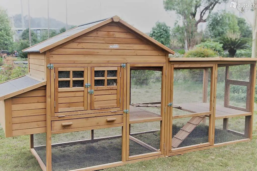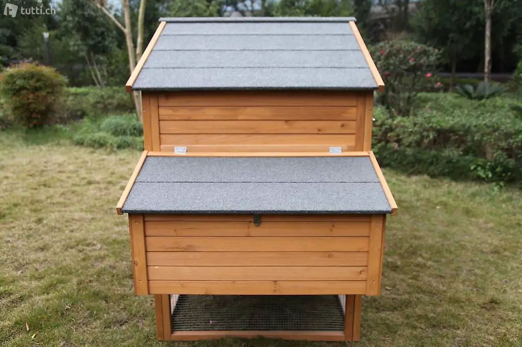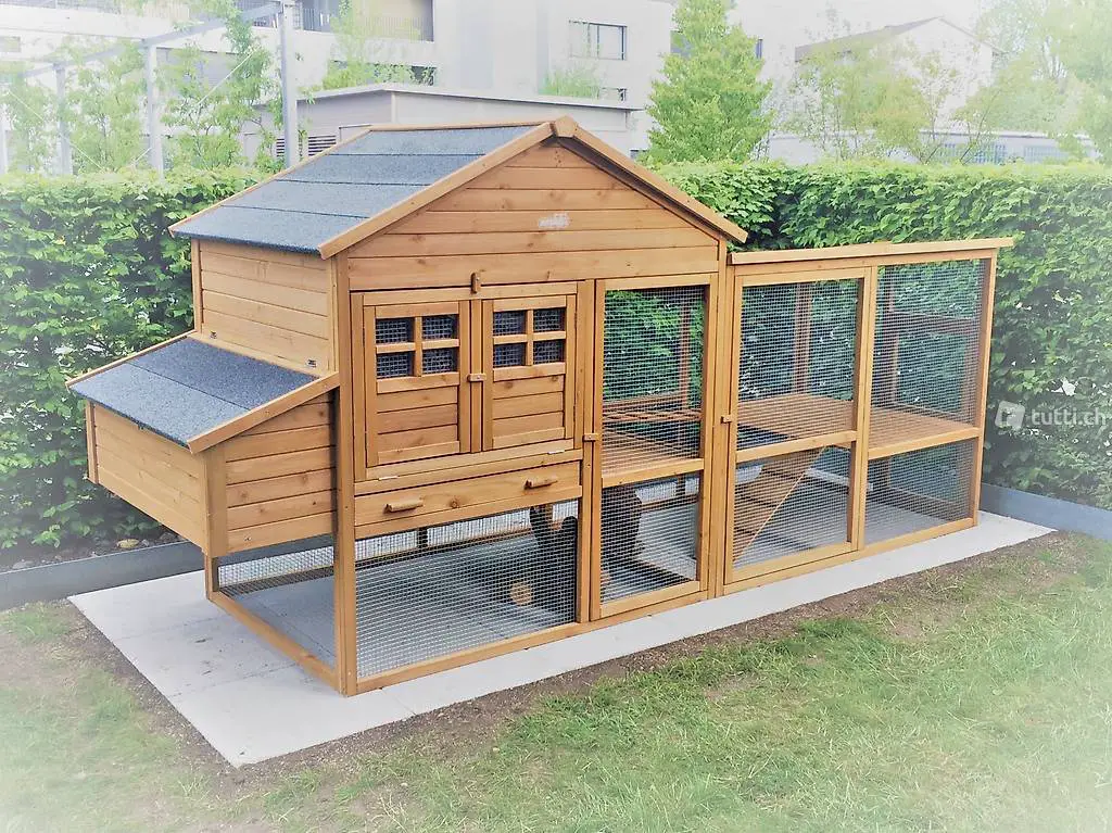 Hühner etc. mit Futter-NestBox Bodenmass 290 x 100 x 160 cm. Wir bauen Kleintierställe in massiver Bauweise und toller Qualität: Mardersichere, verzinkte Gitter 1.2 mm, extra tiefe Wannen und starke Holzrahmen - isolierte Wände und Dächer - kein Vergleich mit Lotter- und Billigangeboten. Vergleichen lohnt sich. 30 - 40 mm Rahmen und 30 mm Profilwände isoliert. Besuchen Sie unseren grossen OUTLET. Infos zu Abholung & Versand 079 306 10 22