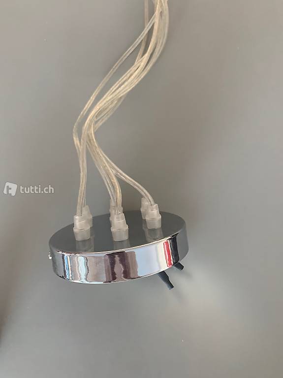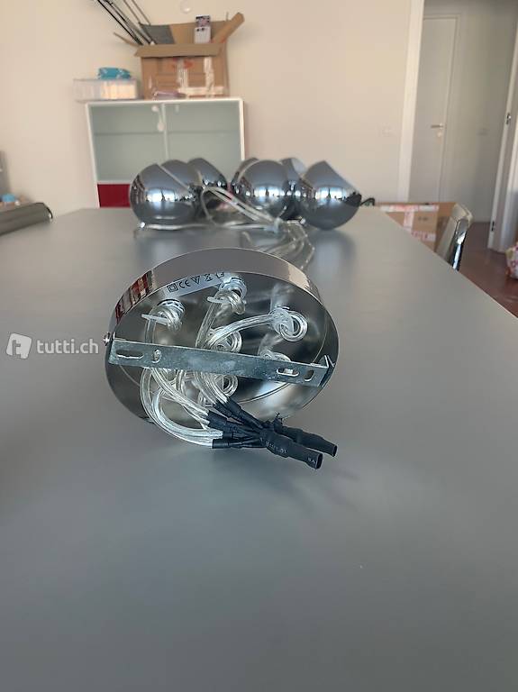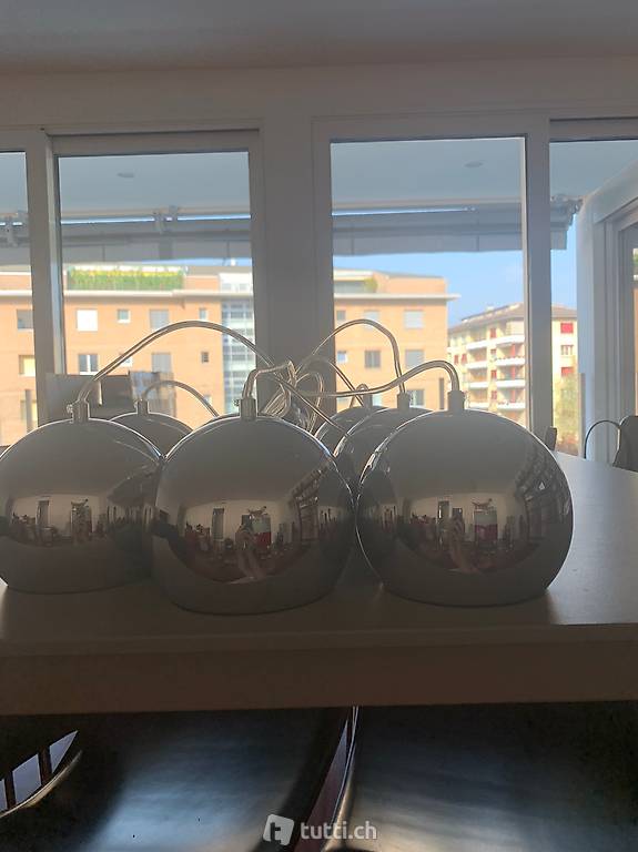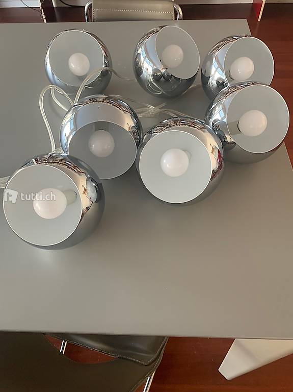Vendo lampadario a sospensione composto da 7 luci. Ogni punto luce è una calotta semisferica cromata di diametro 15 cm con attacco E14. L'apertura della lampadina nella calotta ha diameteo 11 cm.