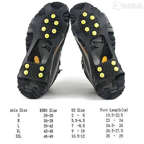 1. sorgfältig befestigen die griffe zu ihre schuhe, start mit der vorderseite und dann stretch die zurück über die ferse zu gewährleisten sie sind sicher angebracht. grosse grösse sind erforderlich wenn tragen über winter schuhe.