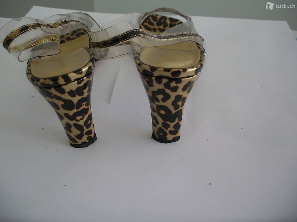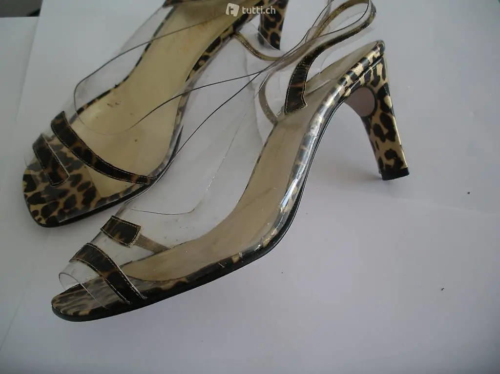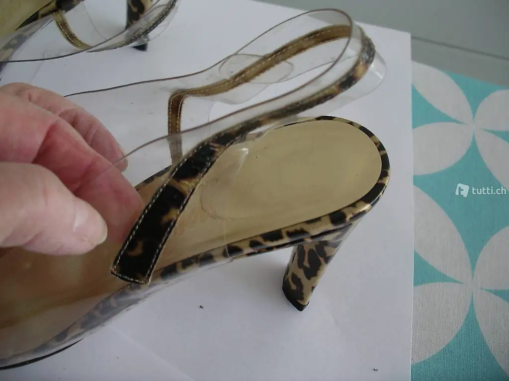 elegante, festliche Sandalette aus durchsichtigem PVC und Leopardenmuster, nur einmal an einem Hochzeit getragen. Der