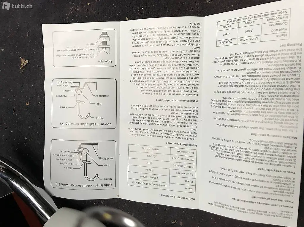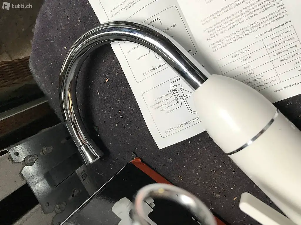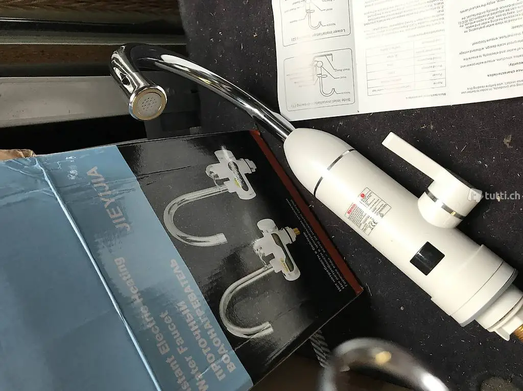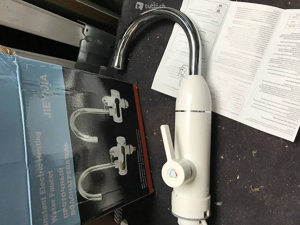 Sehr schneller Wasser Erhitzer im Wasser hahnen eingebaut mit Wahl der Temperatur von 10 bis 95 Grad in Sekundenschnelle heisses Wasser erzeugt. Idal für Küche Bad, Camper Ausbau und vieles mehr. Der Erhitzer ist an 230V Anschluss oder wahlweise auch per Adapter an 12 / 24 Volt oder auch per Solaranlage möglich. Das Gerät ist geprüft und neu. Direkt aus einer PRodukte Vorführung. Wirklich ideal auch in Ferien Häuser oder Ställen, wo immer heisses Wasser benötigt wird. Auf Wunsch versende ich den Wassererhitzer auch per Post gegen PReis plus +Porto 9.70 gerne. Bezahlen können sie per Twint, Giro oder eben Bar bei Abholung.