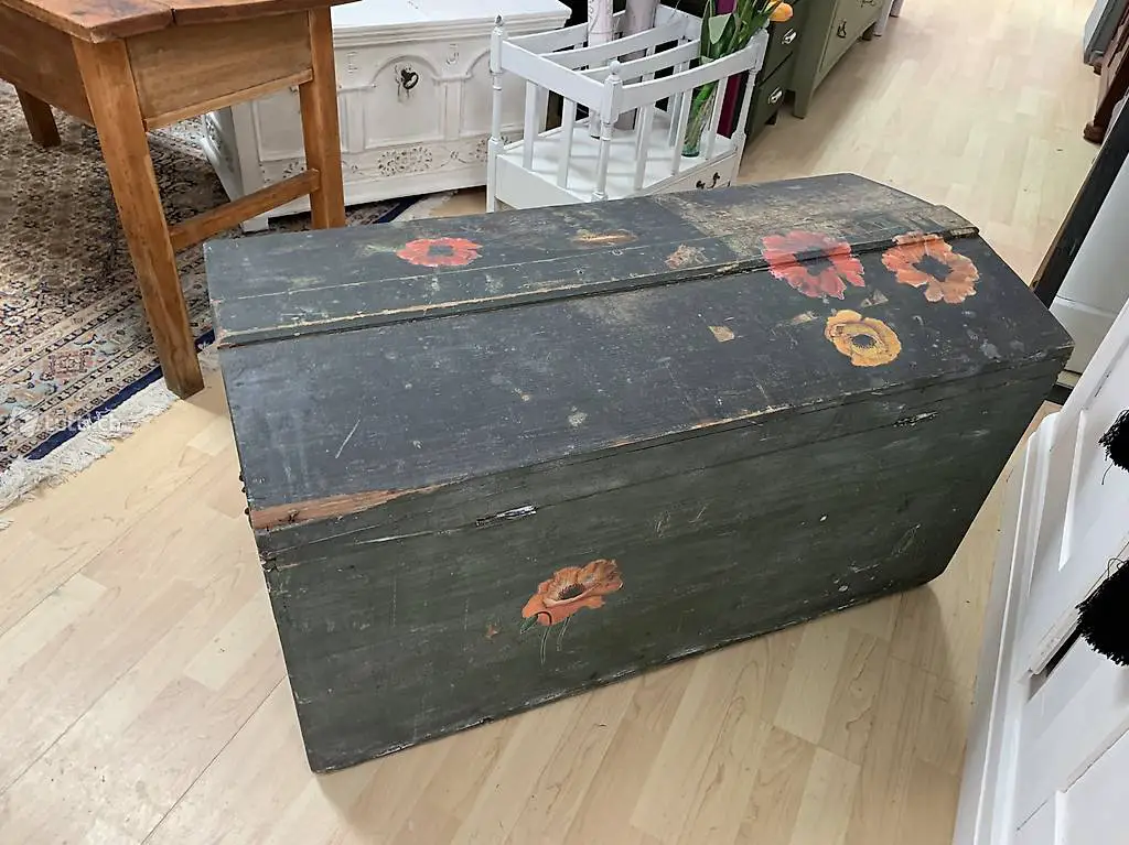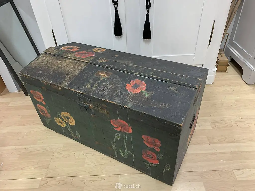 Die Truhe ist rund 100 jährig und von guter, stabiler Qualität. Der Schlüssel ist nicht mehr vorhanden.
