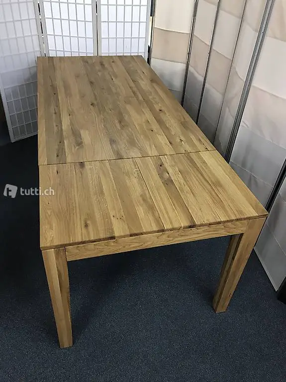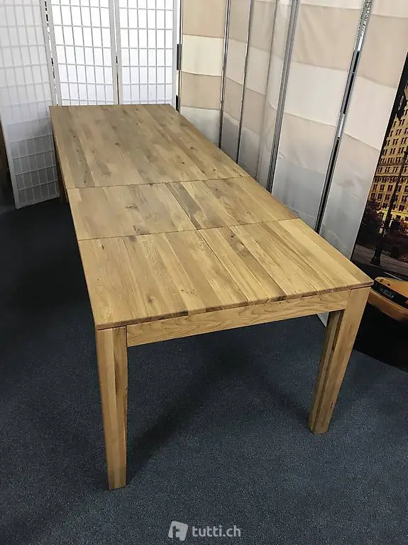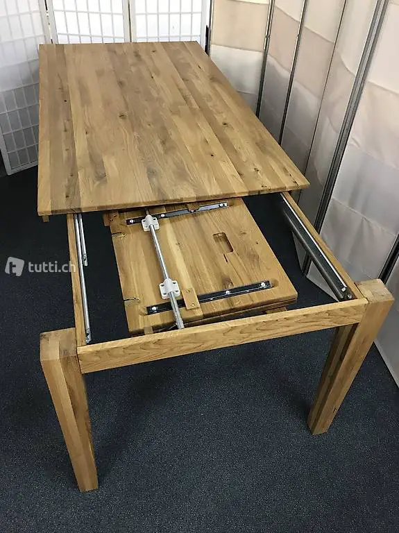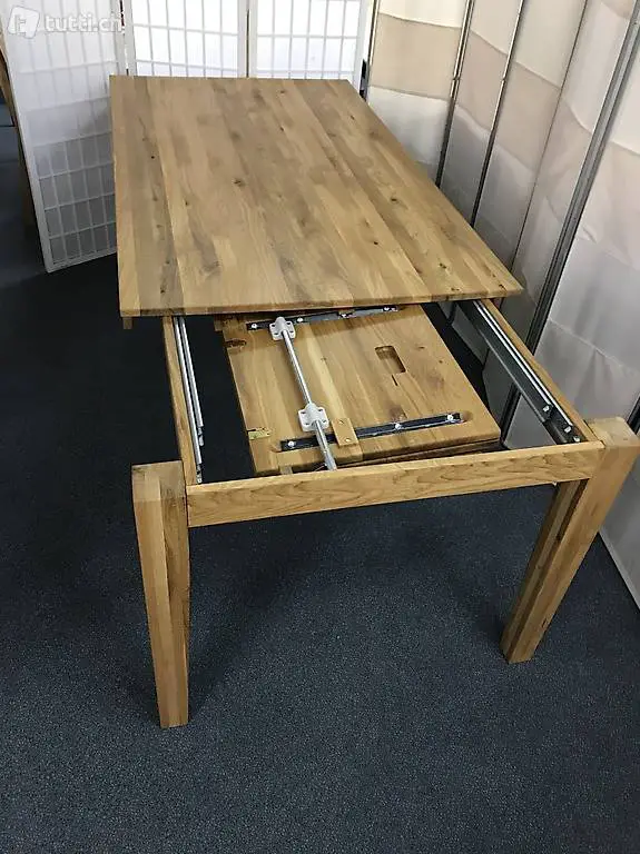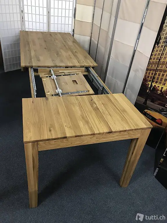 Tisch hat zwei integrierte Auszugsplatten von je 50 cm,