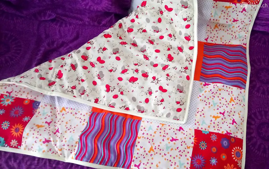 Selbstgenähte Patchworkdecke aus Baumwollstoffen, gesäumt mit Satinband und gefüttert. Super als