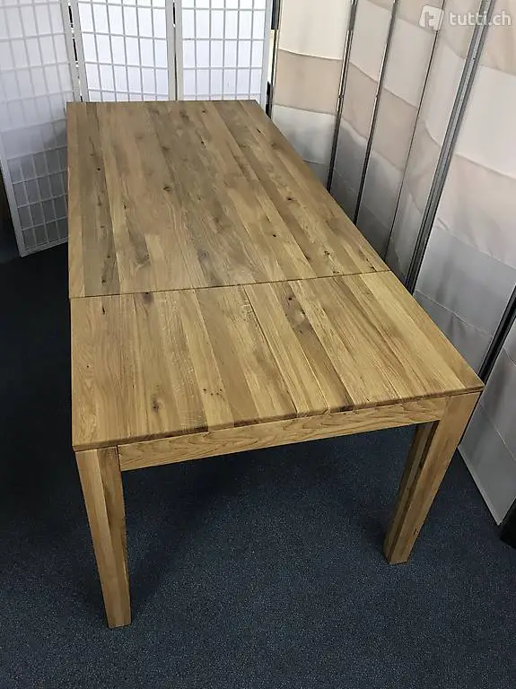 Der Tisch hat eine integrierte Auszugsplatte von 50 cm,