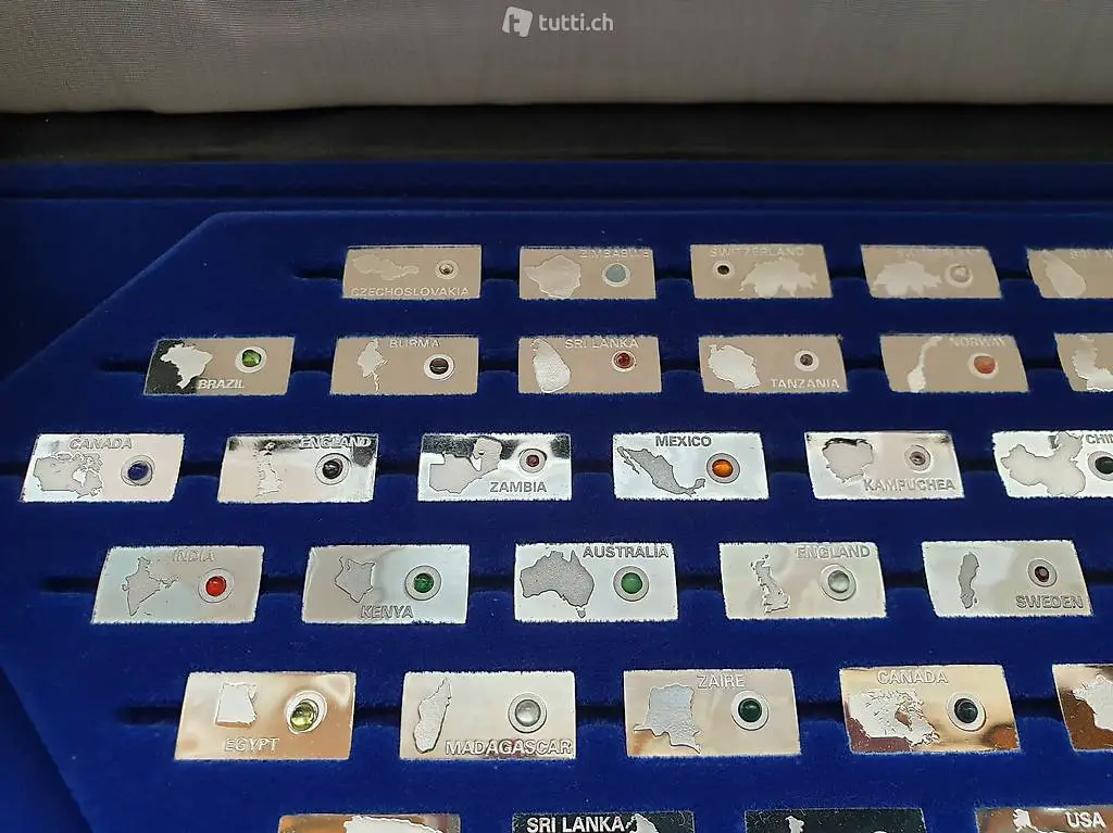 Mini- Barren stellt ein Land dar, das ein grosse Edelsteinproduzent ist. Gewicht: ca. 3 g je Barren, Vorderseite: Landkarte und Namen des jeweiligen Landes und ein in Perlform gefasster
