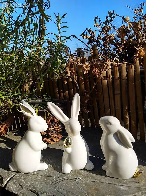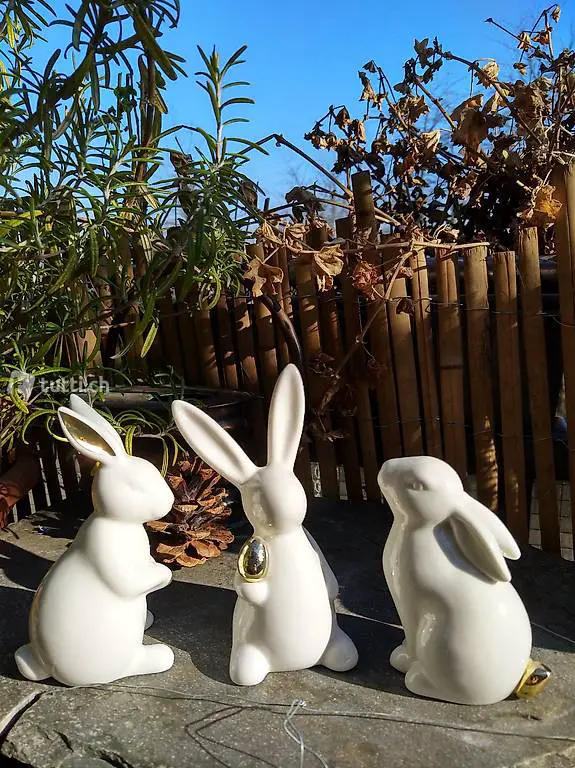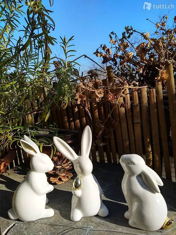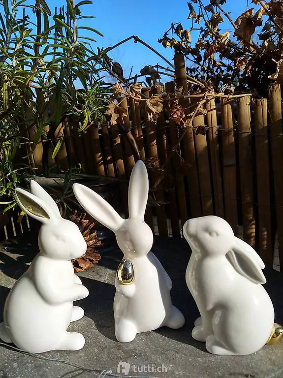 Dekohasen weiss-gold 3er-Set 12 cm. Nur im Dreierset zu verkaufen. Neuwertig und sehr hübsch. Ideal fürs nächste Osterkörbli! Barzahlung und Abholen.