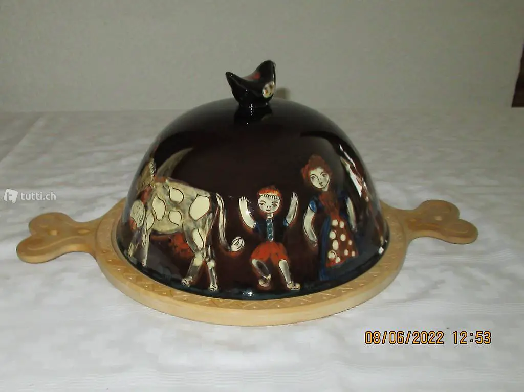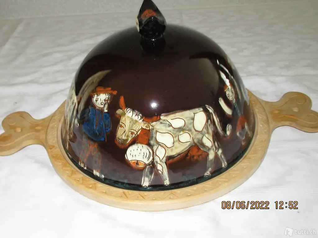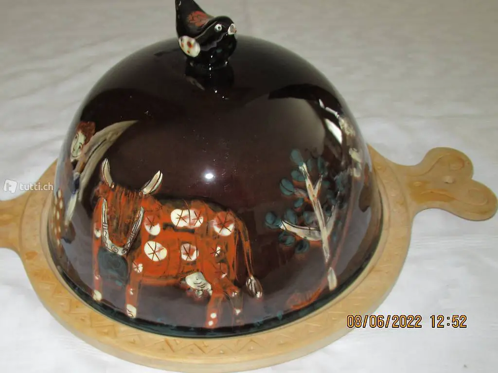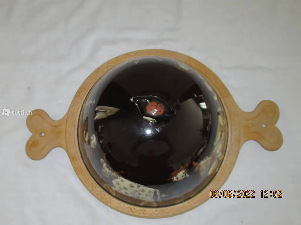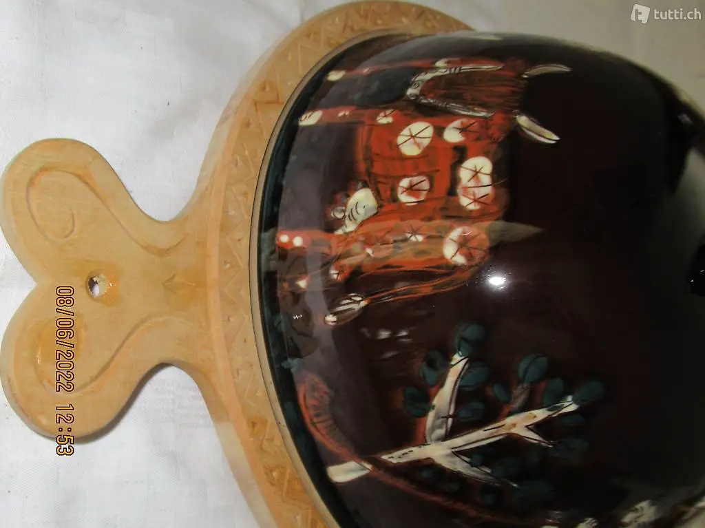 Keramik mit Malerei, Holzunterteller, kaum gebraucht
