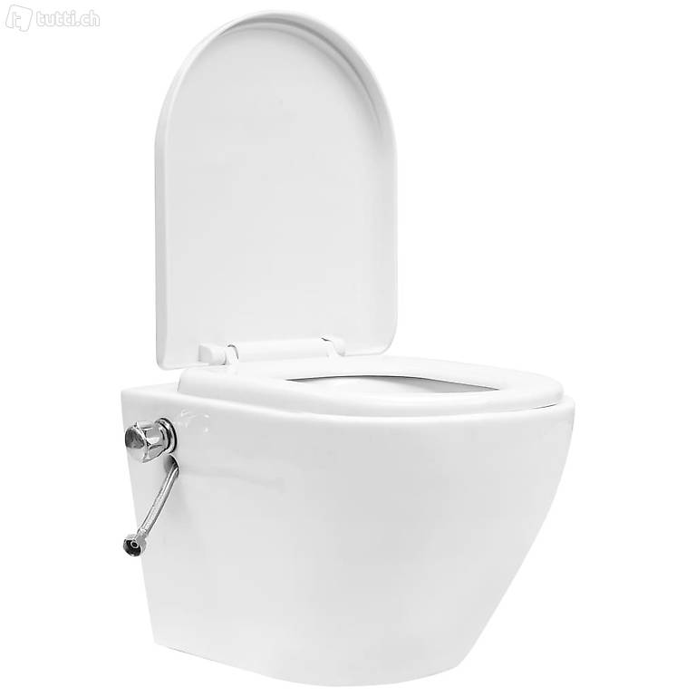 Toilettensitz verfügt über einen Soft-Close-Mechanismus, der ein lautes Zuschlagen des Deckels auf der Toilettenschüssel verhindert. Der Deckel schliesst sich automatisch und sanft durch einen leichten Fingerdruck. Die Toilette mit randloser Spülfunktion hat eine besonders langlebige und leicht zu reinigende Keramikoberfläche. An der schmutzabweisenden Oberfläche bleiben Kalk und Verunreinigungen nicht haften. Zudem verfügt die Toilette über eine Bidet-Düse zur