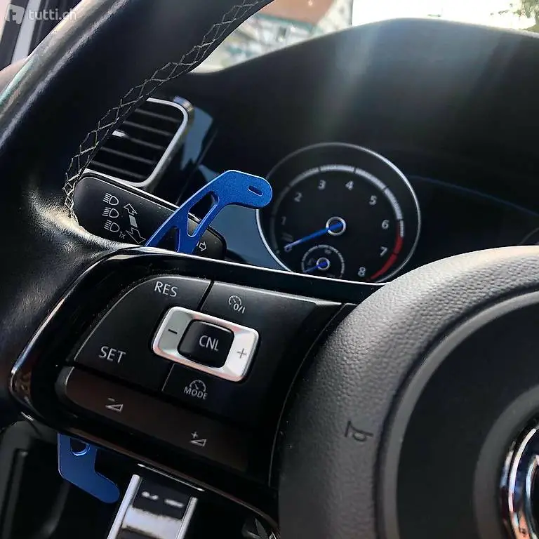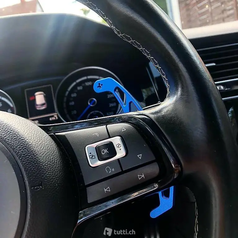 Die Golf 7 Variante 2 Schaltwippen ersetzen die originalen Wippen. Die originalen Schaltwippen werden demontiert und durch unsere Variante 2 Wippen ersetzt. Unsere Variante 2 Schaltwippen werden mit dem original Befestigungssplint am Lenkrad montiert. Der Splint der Original Wippe wird gezogen, die Schaltwippe abgenommen und unsere Aluminium Schaltwippe wird aufgesetzt und mit dem Serienmässigen Splint wieder fixiert.
