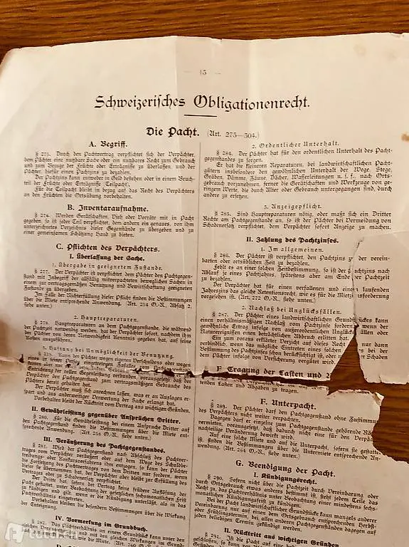 Anhang: Schweizerisches Obligationenrechte über Verpachtung von Land und Inventar.Handschriftlicher Text.